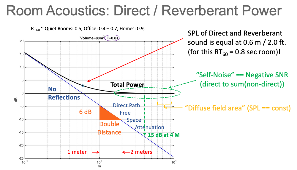 For most reasonably sized rooms this distance is only two or three feet. At distances longer than the critical distance the power of the reverberations (the sum of all the reflections) is greater than the direct sound! That is, the direct-sound to non-direct-sound ratio is negative.